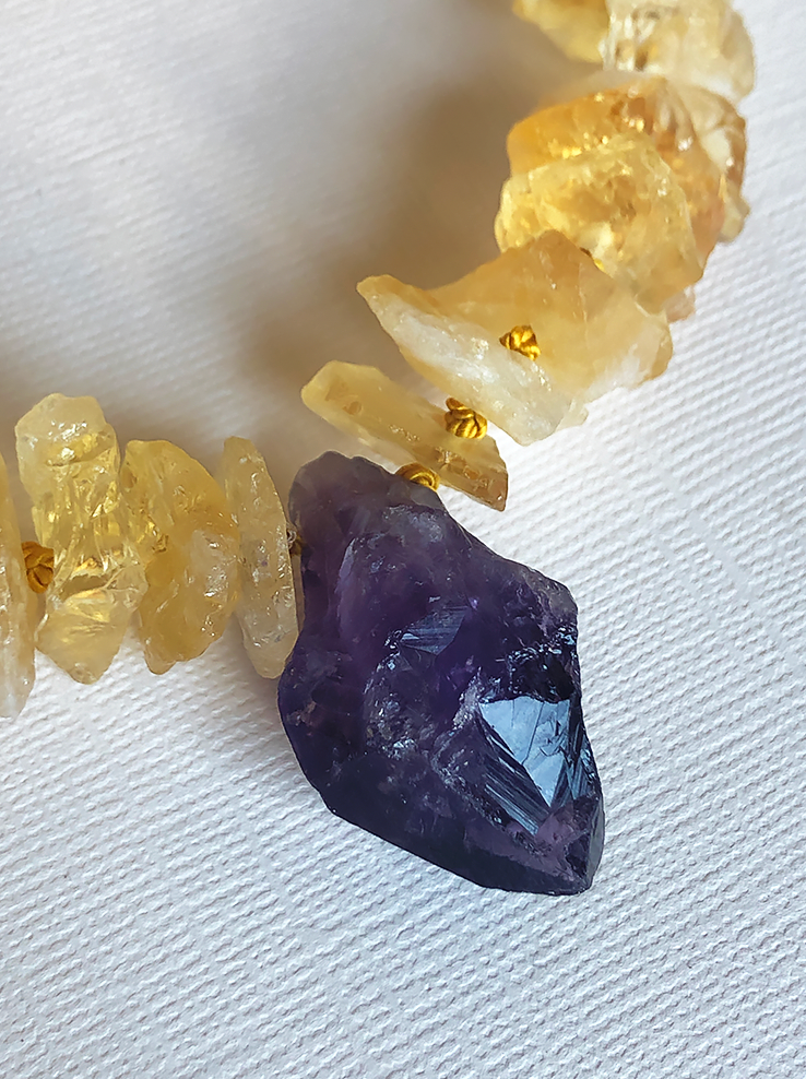 Natural golden citrine with an amethyst nugget pendant from South Africa hand knotted on silk and finished with a handmade sterling silver clasp adorned with citrine gemstones.