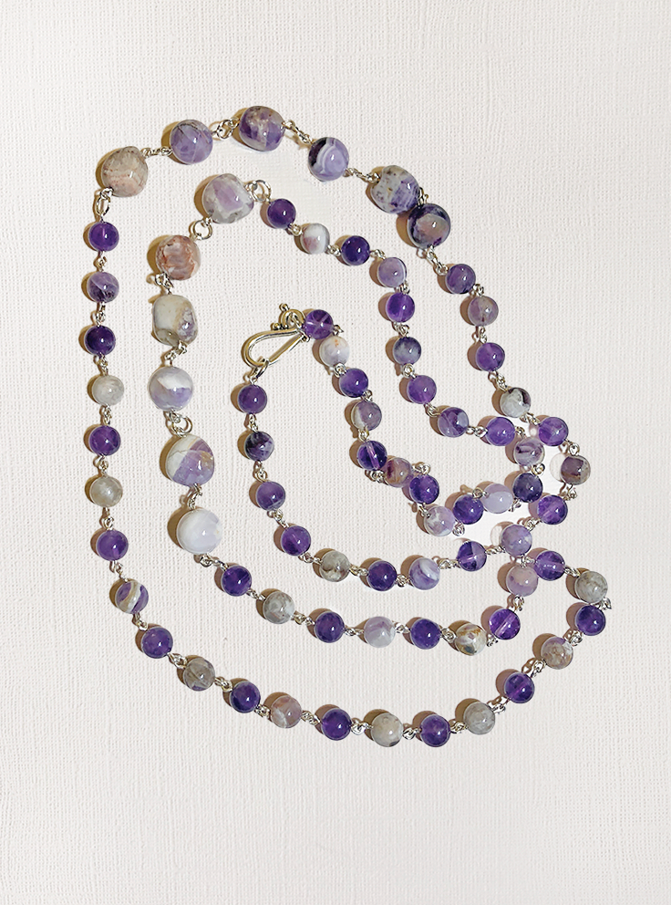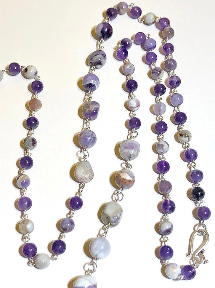 Silver connectors link each purple and sage amethyst gemstone together, meeting at a pewter clasp. Wear it long or doubled.